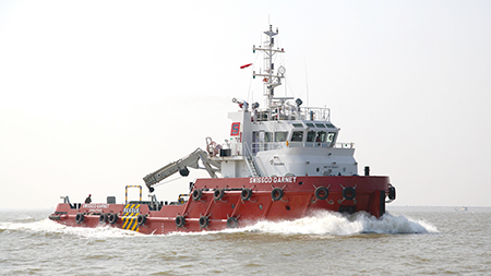 Also in the water, and awaiting delivery by ship to Jeddah, Saudi Arabia, were two 15-meter and one 12-meter line handling or mooring boats. Each of these is powered by a pair of Cummins NT855 each delivering 261 kW at 1800 RPM. Back in the office block the walls are lined with photos of recently delivered vessels. Shipyard Chairman Mr. Luo Chaoneng points out the 39.8 by 10.5-meter BADR 5, delivered this year to a Saudi Arabian customer. A pair of Cummins QSK19-M engines each producing 597 kW at 1800-RPM powers this handy-sized tug.