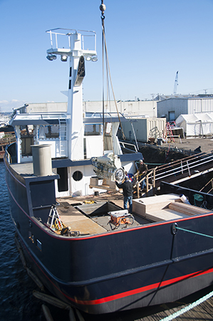 “That boat has been very successful so we made very few changes when we decided to build this one,” explained Trosvig, who has skippered the Cynosure longlining black cod and halibut and pot fishing Alaskan cod. He explained that they run the boat virtually year round with ten crewmembers in total with each man part of a six-man crew rotating about two months onboard for one off. As we spoke on the Seattle waterfront in early March, the engineer was running the boat in the Aleutians as Trosvig had come down to help partner Neil Anderson with the launch and engine installation of the new boat. As with the Cynosure, they rented a space on the Seattle waterfront and oversaw the building of the boat themselves. The new boat was started in May 2012 and will do sea trials in June of 2013.