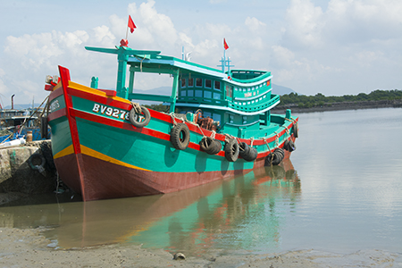 Her green hull siting solidly in the shallows near shore the fishing vessel Tru?ng Sa slowly begins to right herself with the raising tide. As an off-shore fishing vessel, and as her name attests, she is built for deeper waters than this. Tru?ng Sa is the name of the group islands off the coast of Vietnam whose fishing grounds are claimed by foreign nations. Tru?ng Sa’s owner fishes these and other waters on a regular basis.