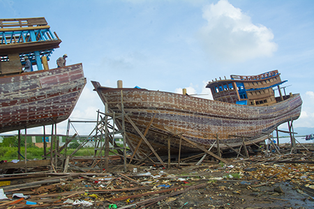 In the shipyard, a perfect boat of some 20+meters is built. Caulking of wood fibers is overlaid with some form of paste. When the hull is finished and faired and a layer of cloth and resin is laid on. This first layer of cloth is held in place by thousands of small nails (2.5 cm.) with large heads 9 m/m). Next a second layer of glass cloth is laid and covered with resin. Finally the boat is painted and launched.