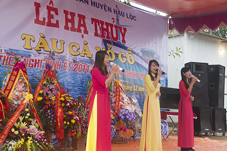 As it is the world over, launch day deserves some ceremony and the village of Hòa Lôc does it well. Performers sang in front of a large poster celebrating the shipyard and the building program. The audience of officials and fishermen were seated under spectacular coloured tents while others gathered around boats in the yard to chat and do business. Cummins’ Vietnam Engine Sales Engineer Linh Cam Nguyen and Cummins resaler Luu Xuân Anh were in attendance. Mr. Nguyen Duc Cuong, a representative of the Fishery Department under the Dept. of Agriculture and Rural Development of Thanhhoa Province, explained that the province had an allocation of 65 new boats, of which 16 had been approved and six had already been completed. With security of the fishing fleets a major concern, he added that the Vietnamese government was developing a new communications system to link all the boats.