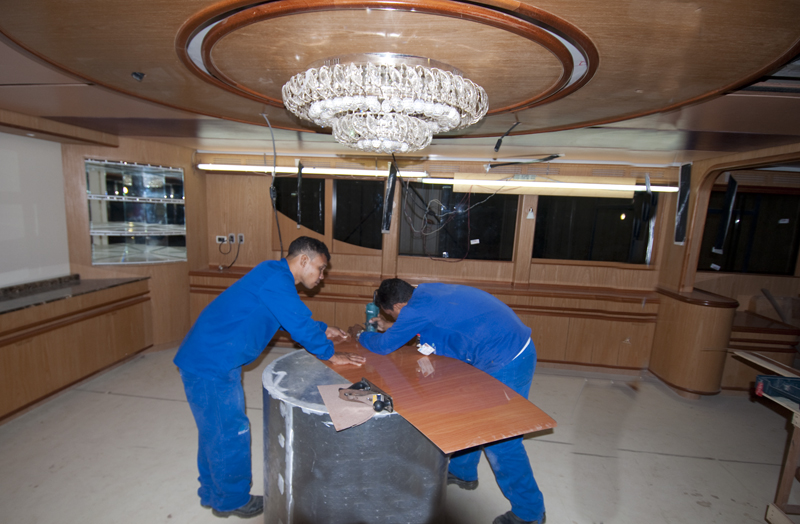 Above the well-equipped wheelhouse a flying bridge will be a great spot for lounging and watching the passing jungle. When finished the boat will be equipped with a small sport fishing boat and launching crane.