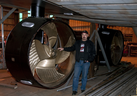 “I can’t say enough about the quality and craftsmanship of the crew at ABD,” enthused Davies. “I went over the drawings with Al Dawson and his partner Burton Drody for the costing, and then Burton prepared the CAD work for the steel cutting. The whole side of the hull above the double chine is formed from only two sheets of steel with one more wrapped around the bow. Everything fit perfectly the first time they put it up. I have inspected every bit of this boat as it was built. When I crawl through a fuel tank after the quality assurance person, I am unable to point out any deficiencies.”