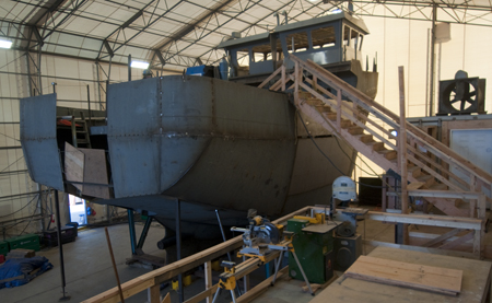 Project manager Justin Huff explains that the most significant difference with this boat is the use of a Nautican nozzle with triple shutter rudders. The nozzle will add towing power and speed while the triple rudder system will give great maneuverability. Another difference from the first vessel, are the rolling chocks. The boat’s 25-foot deck beam tapers slightly to become about 21 feet at the chine. This allows for the installation of 17-inch rolling chocks angled directly out from the chine for maximum effectiveness but still protected by the vessel’s full beam. For added strength the rolling chocks are formed from two pieces with additional internal framing. The void will be filled with vegetable oil and the outer edge will be formed from a 1 1/2-inch solid stainless steel round. “We have noticed too many bent rolling chocks on boats that come in for repair,” Huff said to explain the sturdy construction of these extensions.