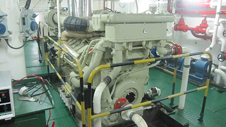 The center-mounted KTA50M2 is capable of also driving a fire-fighting pump through a front mounted power-takeoff. Auxiliary power is provided by a pair of Cummins 6BT5.9DM-powered 80sW generators. The boat is fitted with an electric bow-thruster. All five Cummins engines were supplied by the Cummins Malaysia distributor Scott & English (Malaysia) Sdn Bhd.