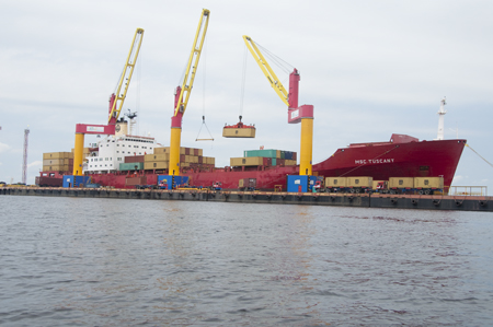 The two existing container terminals, Chibatão and Super Terminals, located next to each other on the Rio Negro, currently handle about 350,000 TEU per year. Plans are in the offing for dramatic increases in the Port’s capacity. With river heights ranging up and down by about 14-meters over the year all terminals are floating and connected to the land by huge ramps. On August 22, 2011 there were four ocean going ships in port with one at anchor in the river and three working cargo at the two floating container ports.