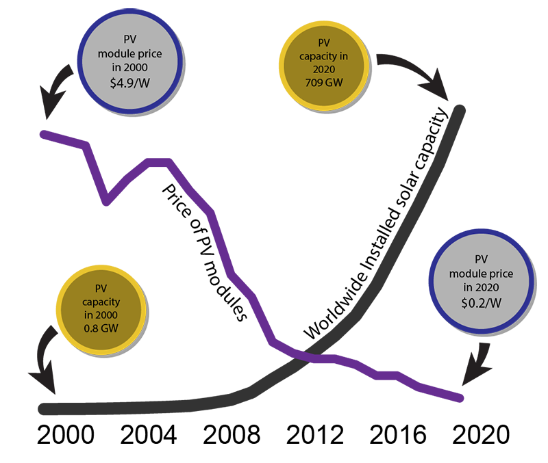 Second, wind turbines, solar panels and energy storage systems have become far more affordable than they were in the past. In the case of solar panels, their price has dropped off a cliff, decreasing by a factor of almost 10 in the past 15 years.